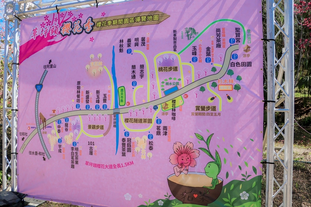 草坪頭櫻花季是南投信義鄉的賞櫻活動網美熱點,通常在每年的1月至3月盛開,以山櫻花、八重櫻、吉野櫻等品種接力綻放,與茶園景色相互輝映,尚有李花、桃花接棒演出花海,值得來趟春季賞花趣。門票請自理。