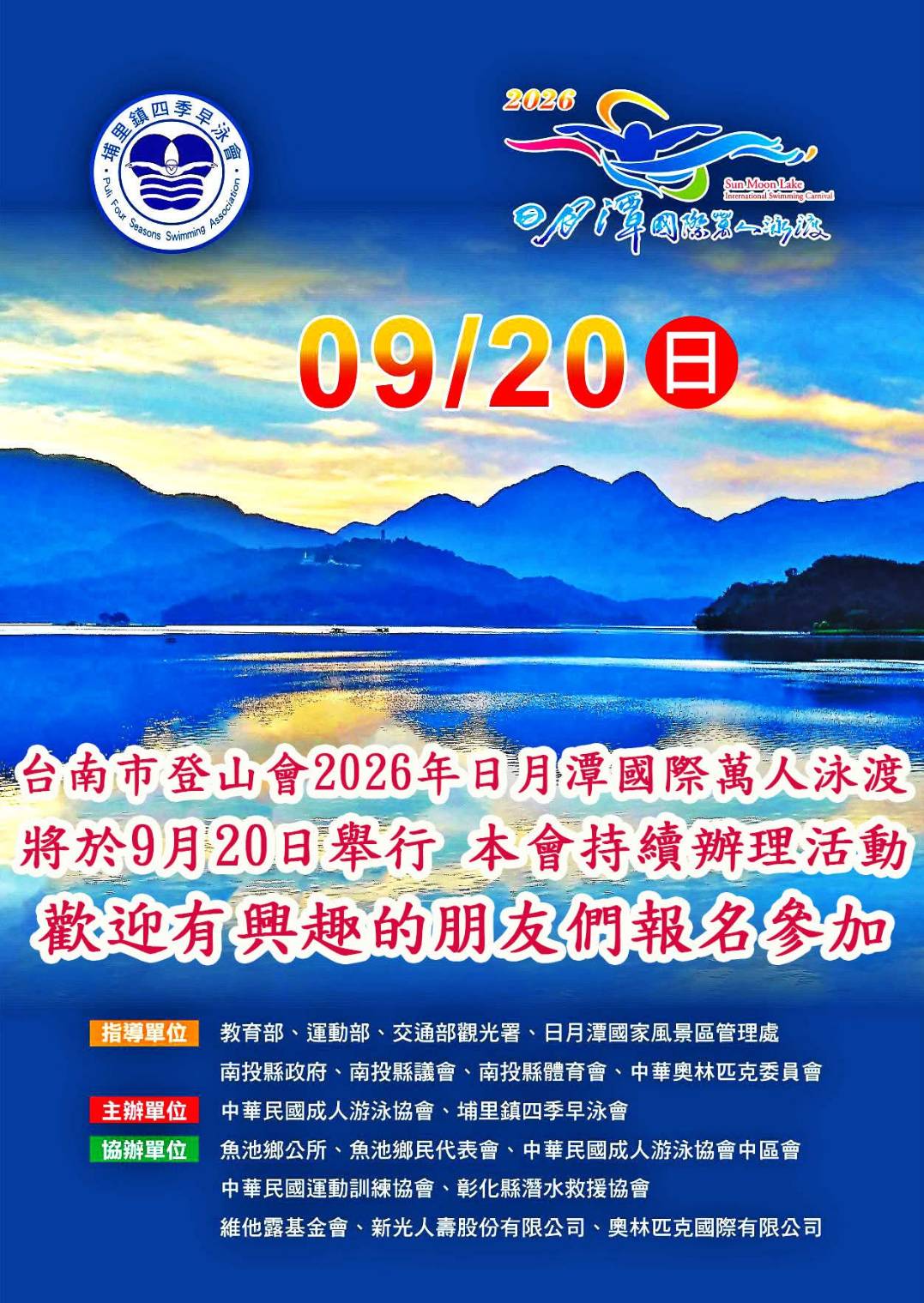 年度盛事-泳渡日月潭,參加泳渡者收費:3000(含車資,報名費,保險,午餐便當,晚餐慶功宴),不泳渡陪行者:1700(含車資、船票、午餐便當、保險,晚餐慶功宴)。 報名截止:6/30日止,以利作業。